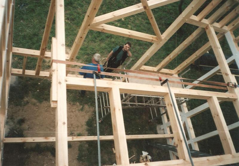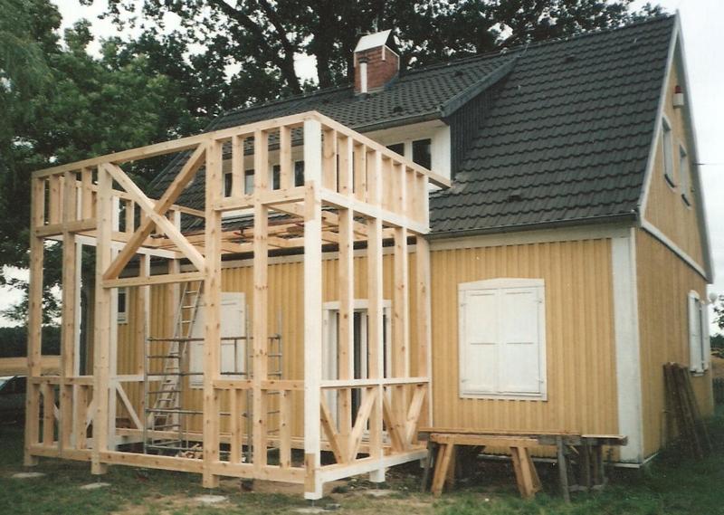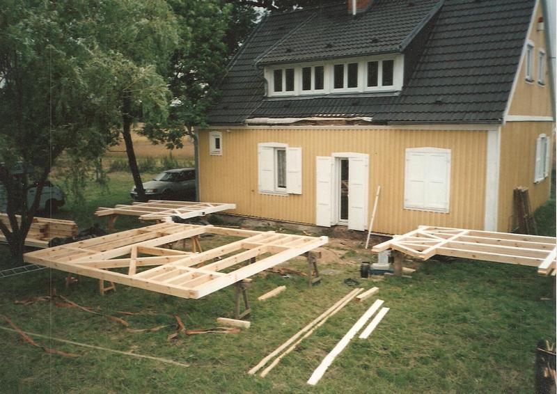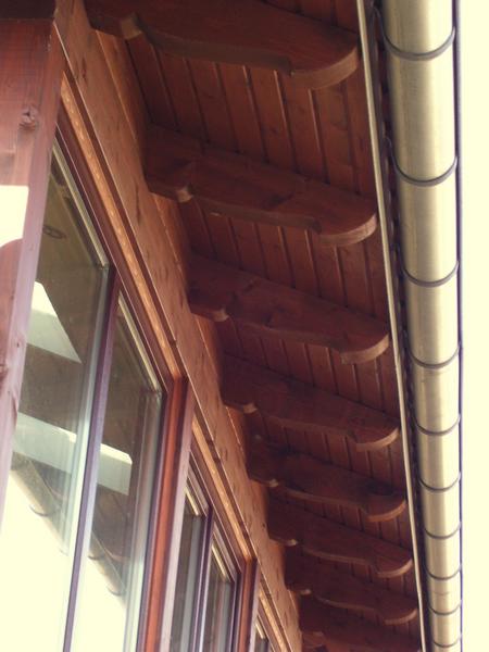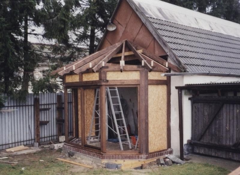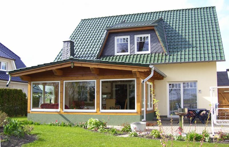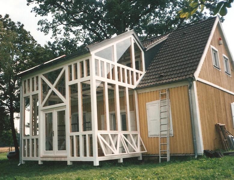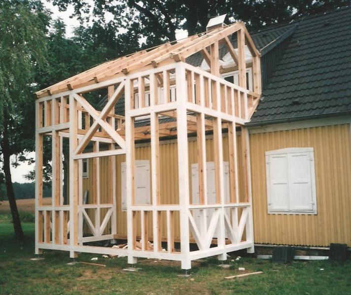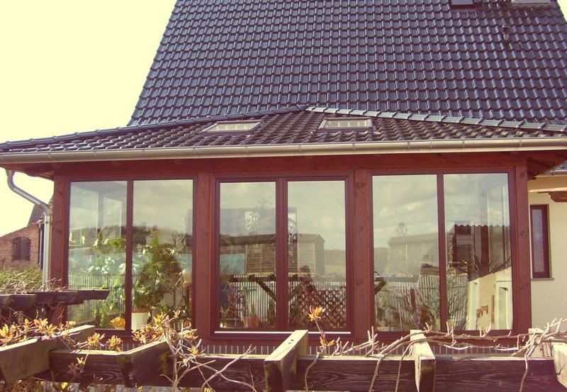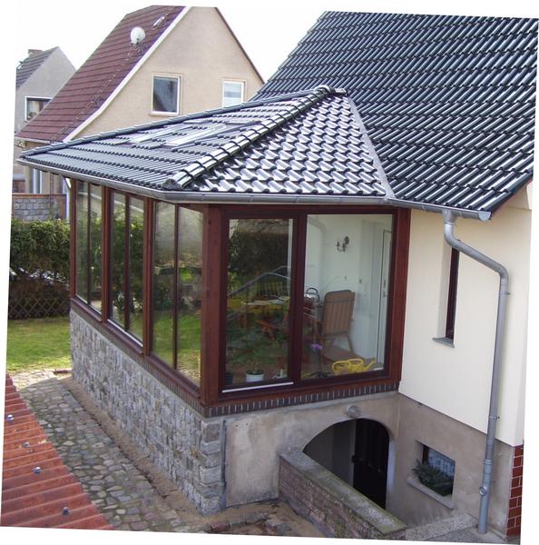 Wintergarten mit abgewalmter Dachkonstruktion mit profilierten Sparrenköpfen und Dachfenstern zur Entlüftung